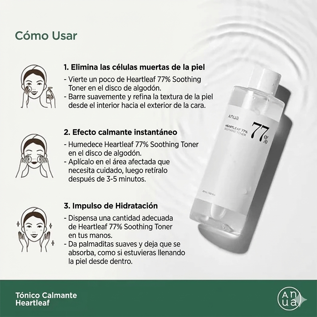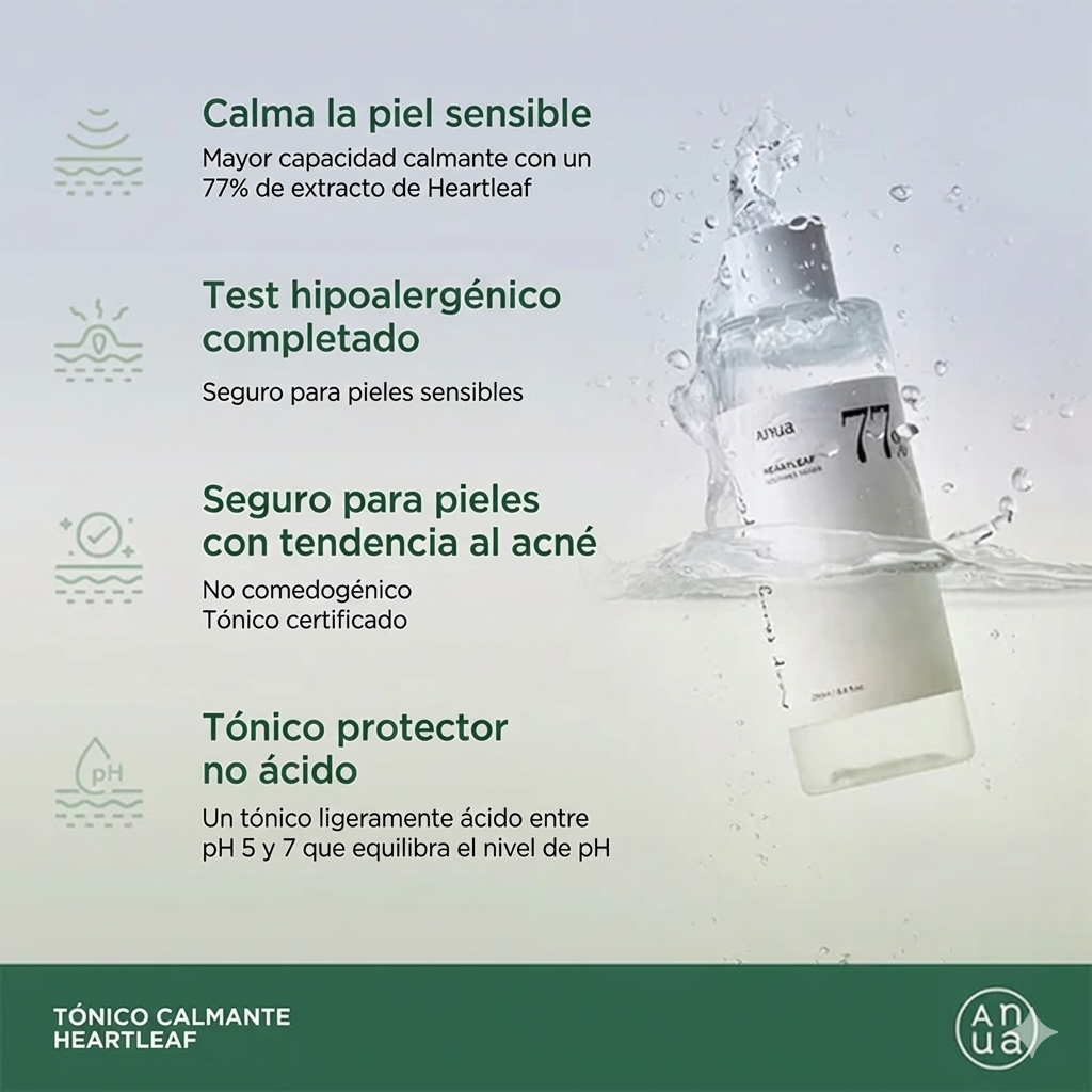 El Heartleaf 77% Soothing Toner es un tónico hidratante que contiene una alta concentración de extracto de Houttuynia Cordata (77%). Este ingrediente estrella es conocido por sus propiedades calmantes y su capacidad para proteger la piel de irritaciones externas. La fórmula levemente ácida del tónico ayuda a mantener el equilibrio entre el aceite y la humedad de la piel, lo que lo hace adecuado para todo tipo de pieles, incluidas las sensibles. Además, el producto contiene 11 tipos de ingredientes de grado verde EWG, garantizando una experiencia no irritante. Entre sus ingredientes adicionales se encuentran el extracto de Centella Asiatica, que es famoso por sus propiedades regeneradoras y calmantes, y el extracto de flor de Chamomilla Recutita, conocido por sus efectos antiinflamatorios. con una textura ligera y a la vez súper hidratante, este tónico se absorbe fácilmente en la piel, dejándola fresca, iluminada y equilibrada.